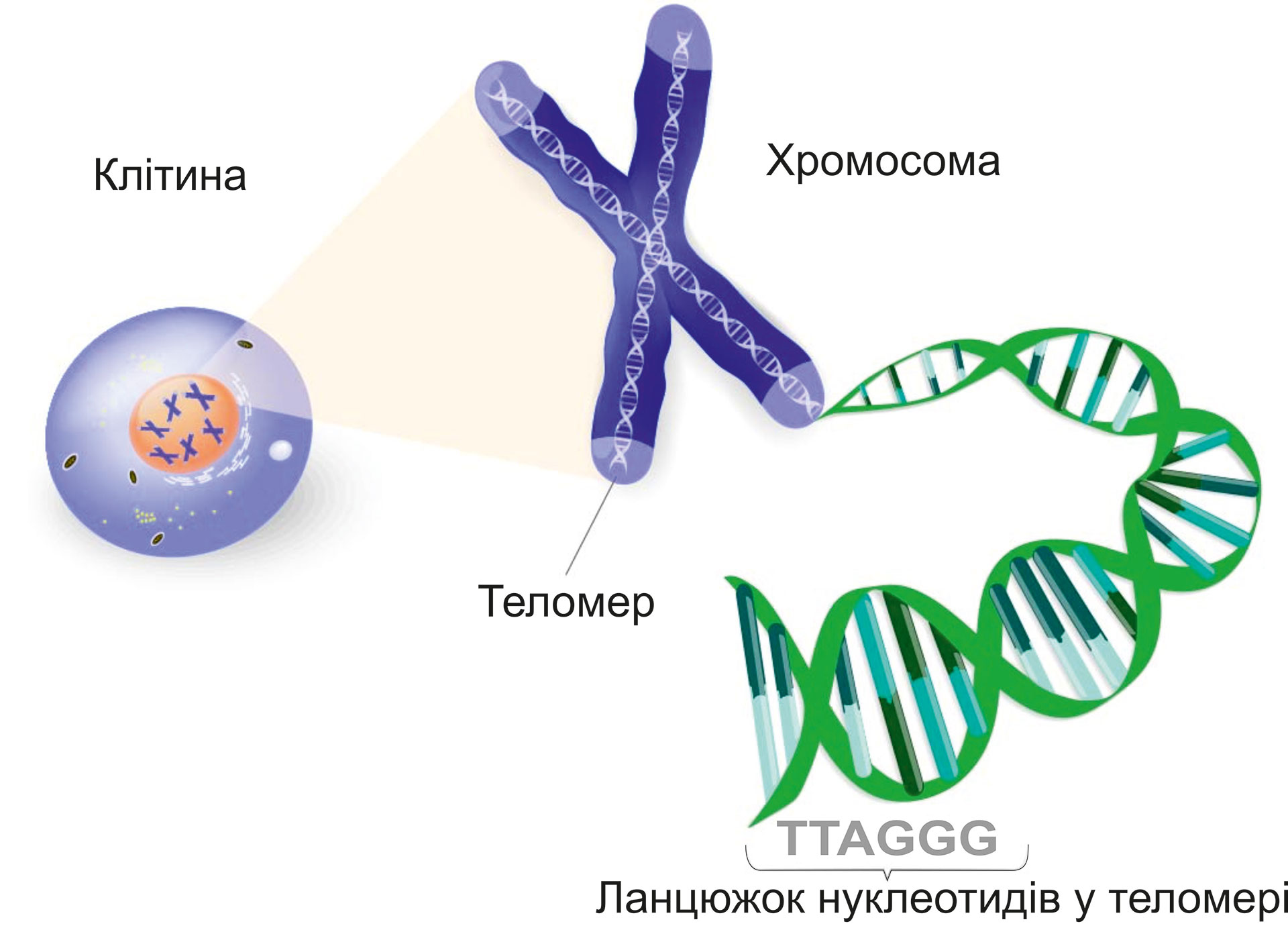 Теломери – це спеціалізовані повторювані нуклеотидні послідовності ДНК (TTAGGG у людини), які знаходяться на кінцях хромосом. Вони діють як "ковпачки", захищаючи генетичний матеріал від пошкоджень під час поділу клітин.
