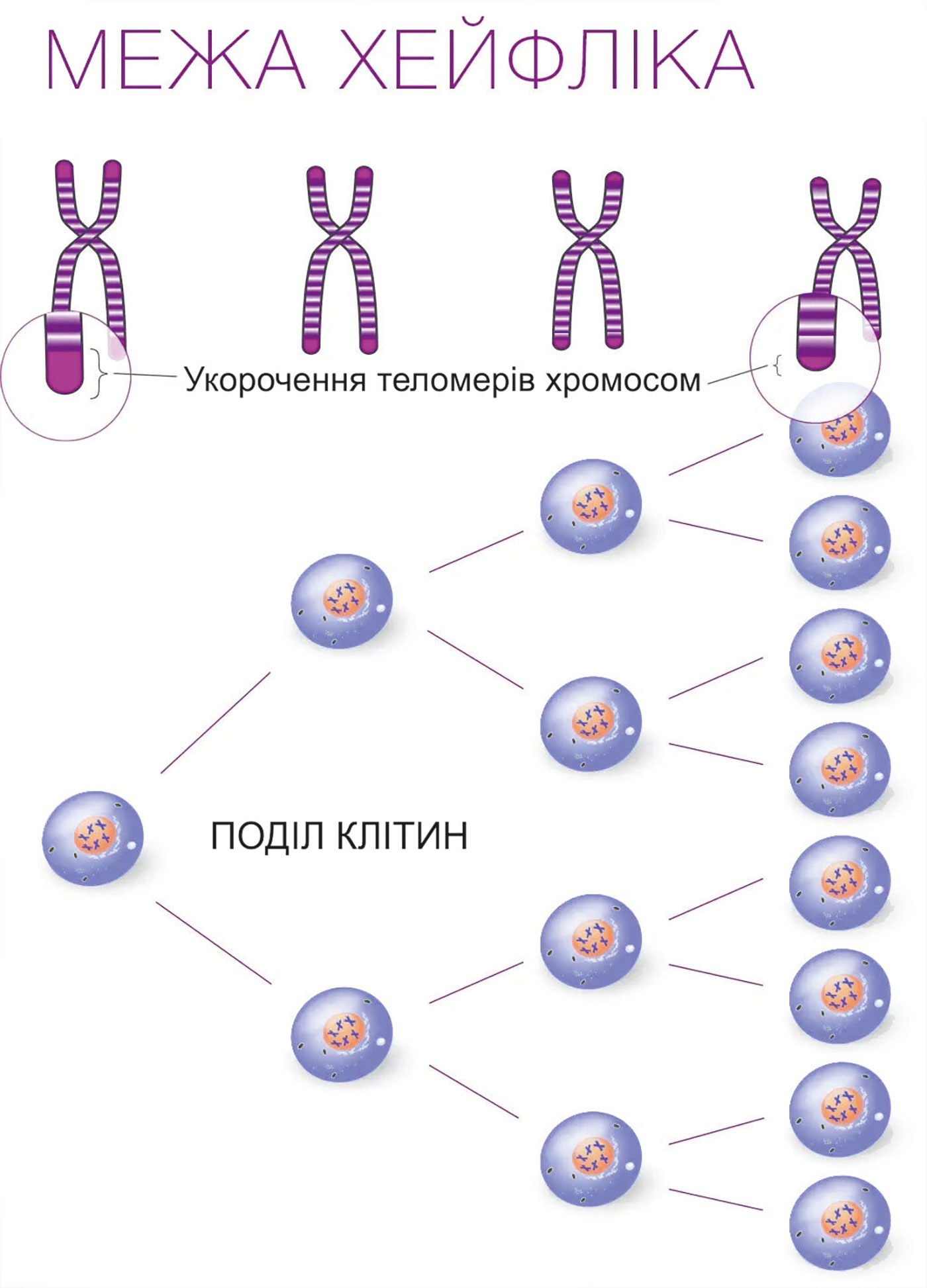Більшість клітин організму людини можуть ділитись 52 рази, після чого клітина припиняє своє існування. У науці це отримало назву Межа Хейфліка (Hayflick limit) на прізвище вченого, який відкрив цей феномен у 1961 році. Це відкриття спонукало вчених до більш глибокого вивчення ролі тіломірів.